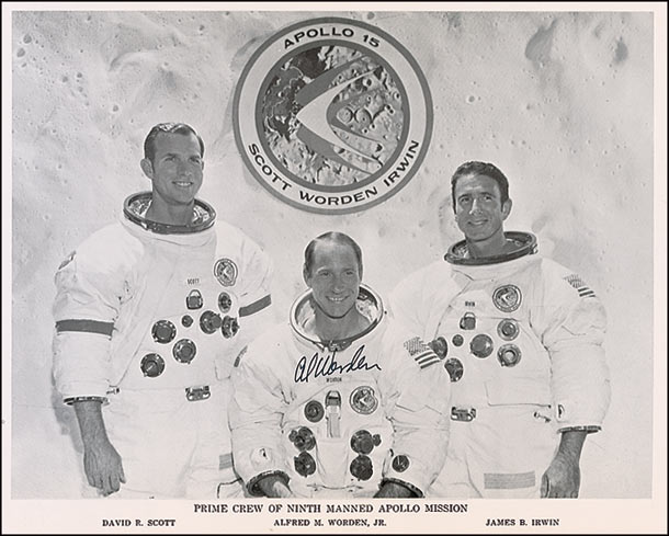 Three items: two cardstock photos, a 10 x 8 portrait of the Apollo 15 crew and an 8 x 10 photo of Worden in his spacesuit, each signed in black felt tip; and a felt tip signature, “Al Worden,” on a 3.5 x 2 collector’s card. In fine condition.