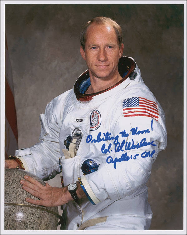 Color satin-finish 8 x 10 photo of Worden posing in his white spacesuit with a globe of the moon, signed in blue felt tip, “Orbiting the moon! Col. Al Worden, Apollo 15 CMP.” In very fine condition.