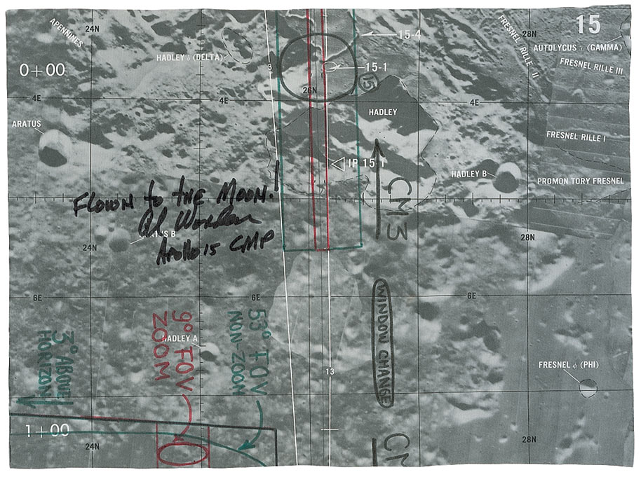 Flight-flown lunar map, used during the Apollo 15 flight. Map section measures 10.5 x 7.75, and shows the Hadley crater and Delta, and also what appears to be the mission’s landing site. Map also bears three vertical felt tip lines and several notations. Signed in black felt tip on the left side, “Flown to the Moon! Al Worden, Apollo 15 CMP.” In fine condition, with a central vertical fold, and a few light wrinkles. Accompanied by a letter of authenticity from Worden, as well as a photocopied certificate of authenticity from Dave Scott and Aurora, from whose collection the map originated. An interesting piece from one of the most scientific of all the Apollo missions.