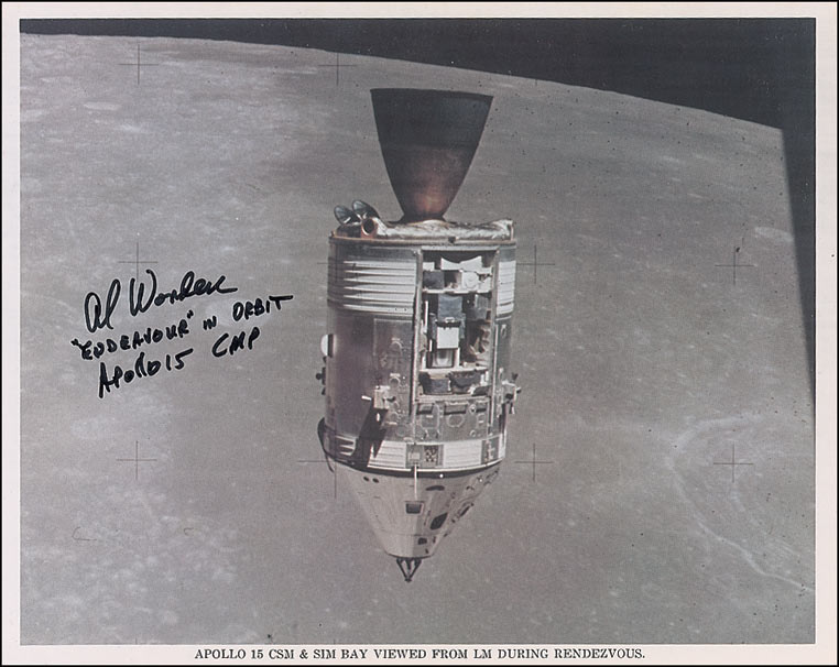 Color 10 x 8 NASA photo of the Apollo 15 module during rendezvous, signed in black felt tip, “Al Worden, ‘Endeavour’ in Orbit, Apollo 15 CMP.” In fine condition.
