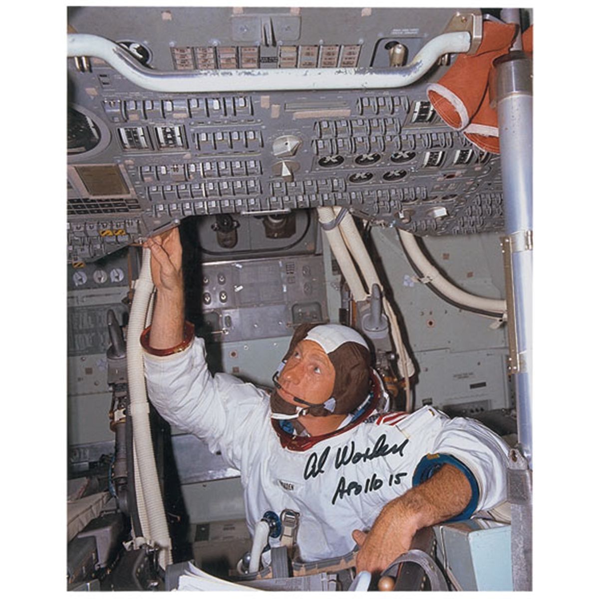Color satin-finish 8 x 10 photo of Worden inspecting a panel in his spacecraft, signed in black felt tip, “Al Worden, Apollo 15.” In very fine condition.