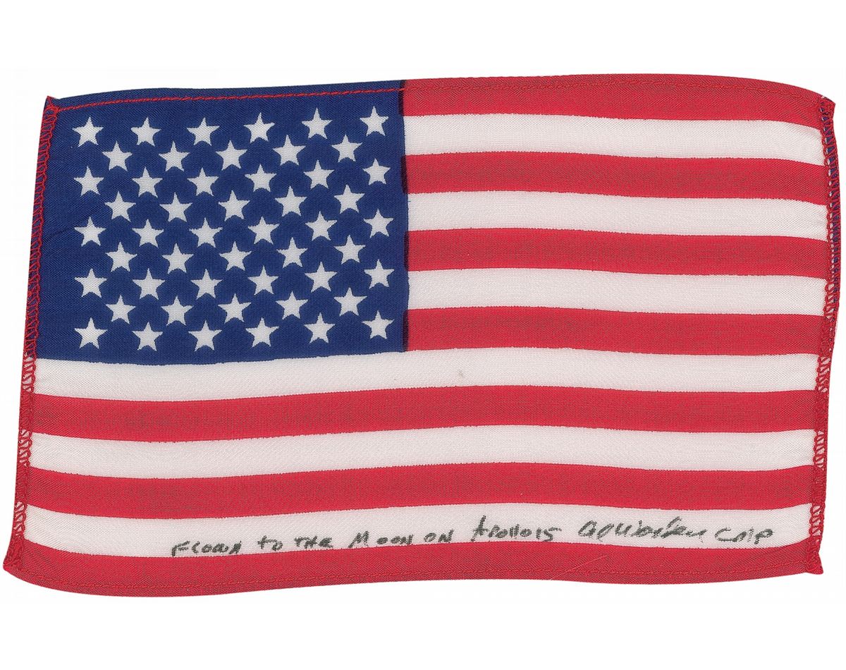 Flown printed American flag, 6 x 4, flown onboard Apollo 15, signed on a white stripe in black felt tip, “Flown to the moon on Apollo 15, Al Worden CMP.” Accompanied by a certificate of authenticity from Al Worden, which reads, in part: “I hereby certify that the United States flag included with this letter and marked with my signature and flight number went to the moon aboard Apollo 15 in the spacecraft ‘Endeavour.’ It remained in the command module during the lunar orbit phase of the flight. It has been in my personal possession since then.” In fine condition. A very desirable astronaut-certified flown artifact.