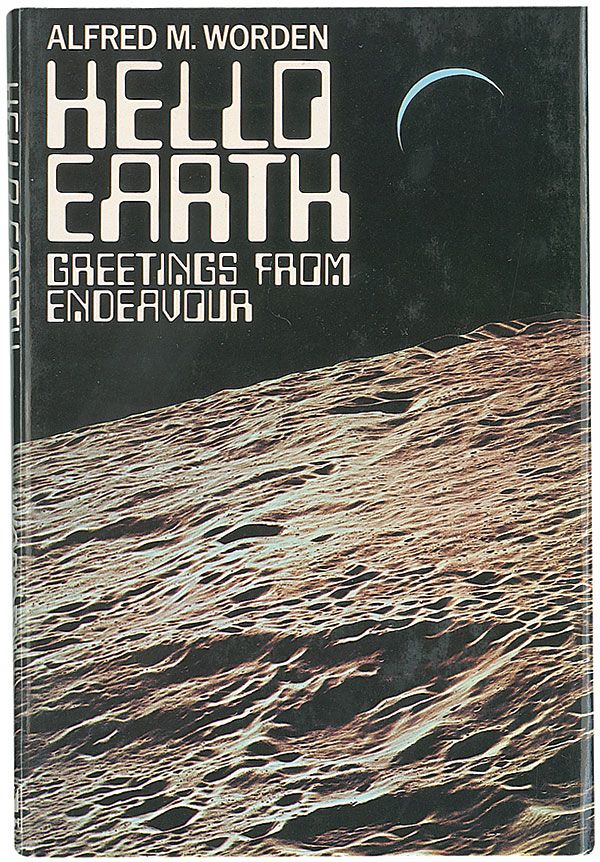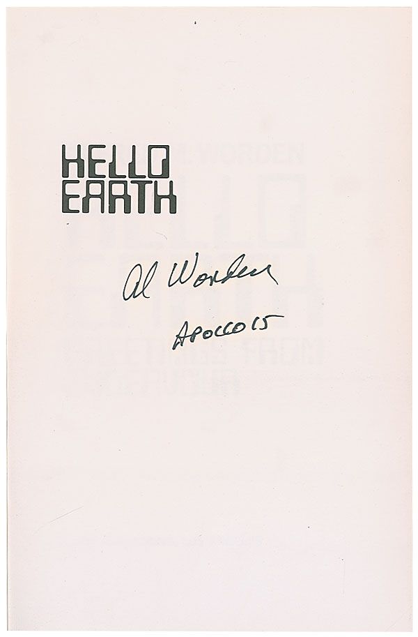 Signed book: Hello Earth. First edition, first printing. Los Angeles: Nash Publishing, 1974. Hardcover with dust jacket, 6.5 x 8, 80 pages. Signed on the half-title page in black felt tip, “Al Worden Apollo 15.” In fine condition, with some slight haloing to signature.