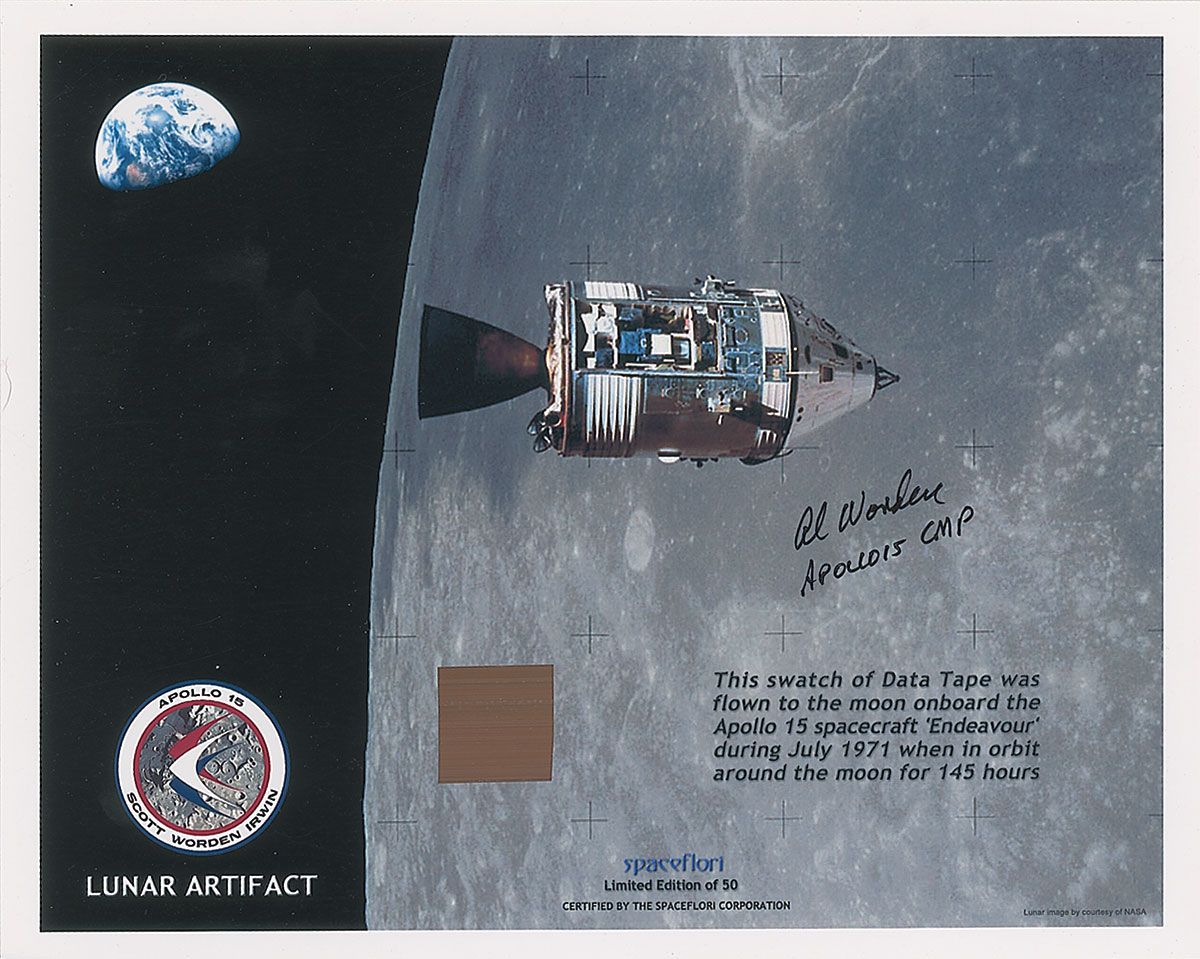 A limited edition presentation of a 1 x 1 square of flown data tape. Tape is affixed to a color 10 x 8 photo of the Command Module Endeavour orbiting the moon, with a printed statement that reads, “This swatch of DATA Tape was flown to the moon onboard the Apollo 15 spacecraft ‘Endeavour’ during July 1971 when in orbit around the moon for 145 hours.” Signed in black felt tip, “Al Worden, Apollo 15 CMP.” In fine condition. Accompanied by a certificate of authenticity from Worden.