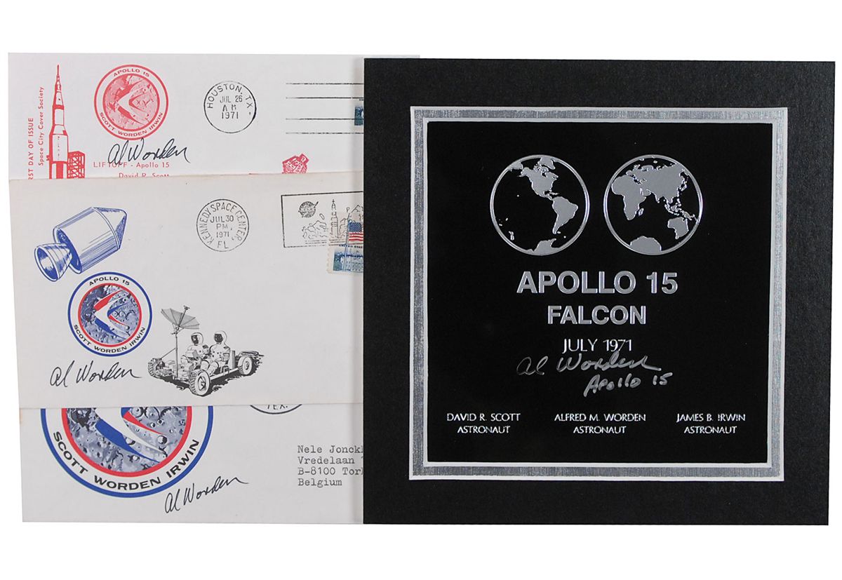 Four items: one engraved plaque honoring the Apollo 15 Falcon, 5.25 x 5.25, signed in silver ink, “Al Worden, Apollo 15,” and matted to an overall size of 7.25 x 7.25; and three commemorative covers honoring various aspects of Apollo 15, each signed in black felt tip. In overall fine condition.