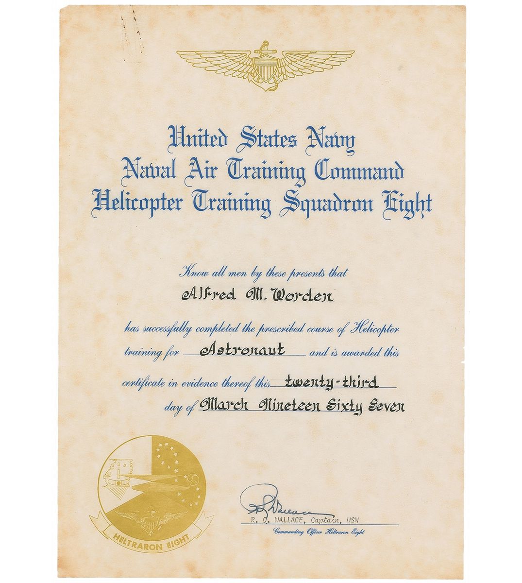 Certificate issued to Worden by Helicopter Training Squadron Eight of the US Navy, one page, 8.5 x 12, March 23, 1967. In part: “Know all me by these presents that Alfred M. Worden has successfully completed the prescribed course of Helicopter training for Astronaut.” Signed at the conclusion by Captain R. Q. Wallace. In very good condition, with moderate overall foxing and rusty paperclip marks to the upper left corner.