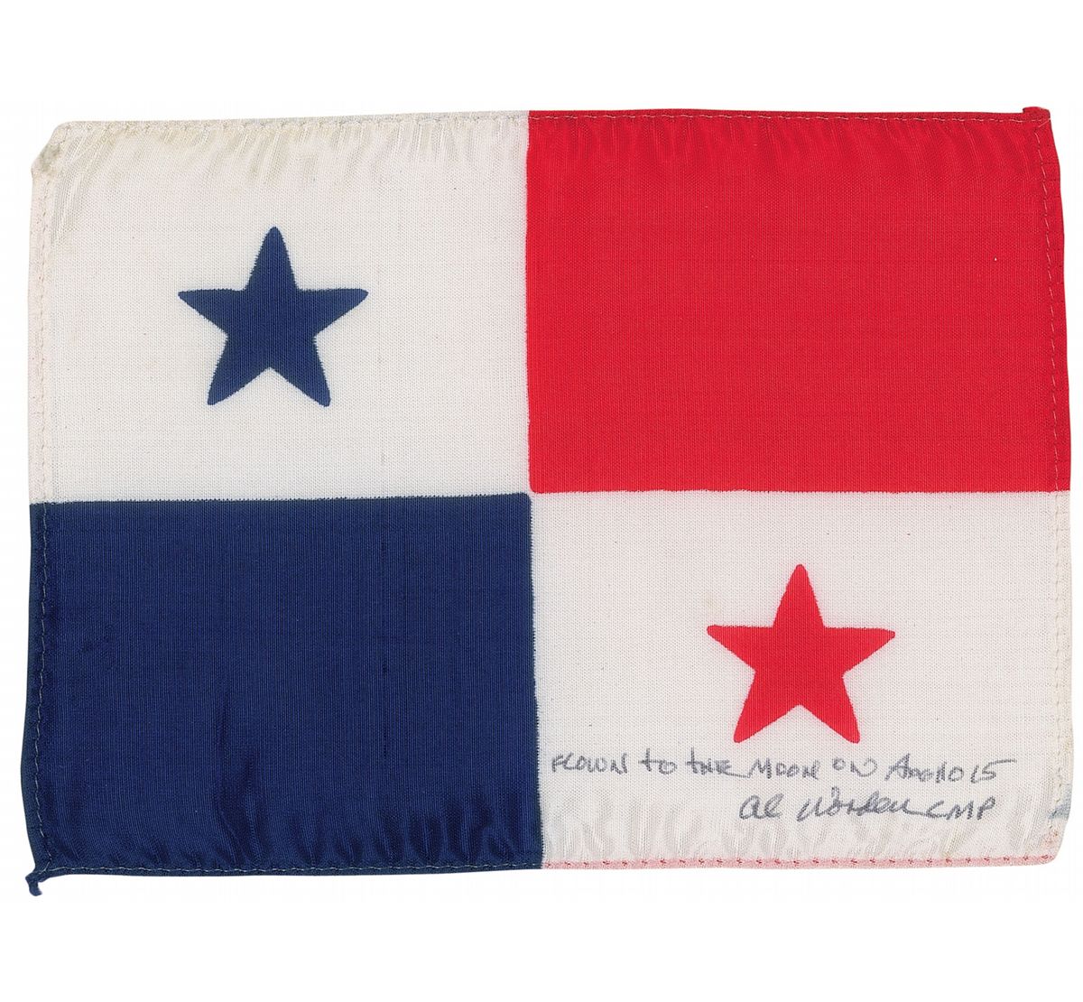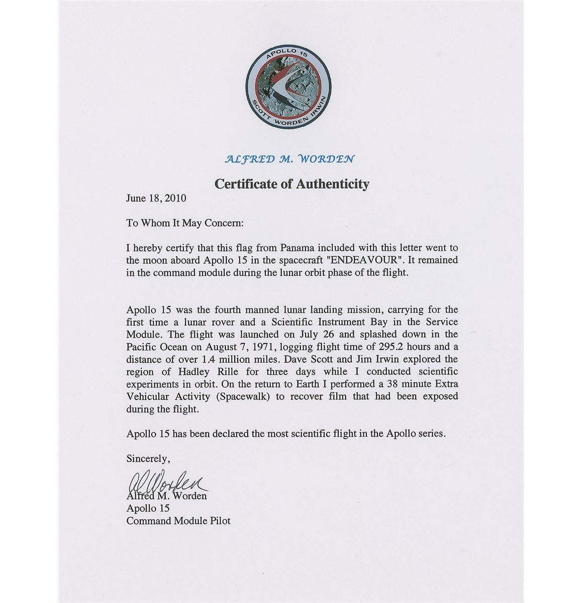 Flown fabric flag of Panama carried on board Apollo 15, 6 x 4.25, signed and flight-certified in black ink by Command Module Pilot Al Worden, “Flown to the Moon on Apollo 15, Al Worden CMP.” In fine condition. Accompanied by a letter of authenticity signed by Worden, in part: “I hereby certify that this flag from Panama included with this letter went to the moon aboard Apollo 15 in the spacecraft ‘Endeavour.’ It remained in the command module during the lunar orbit phase of the flight.”