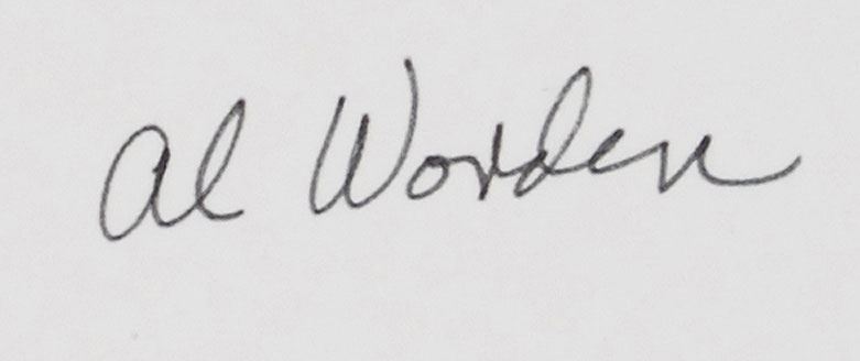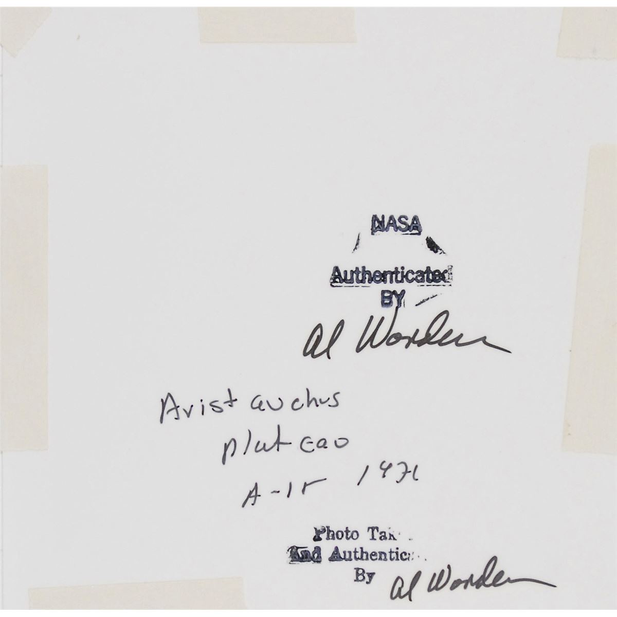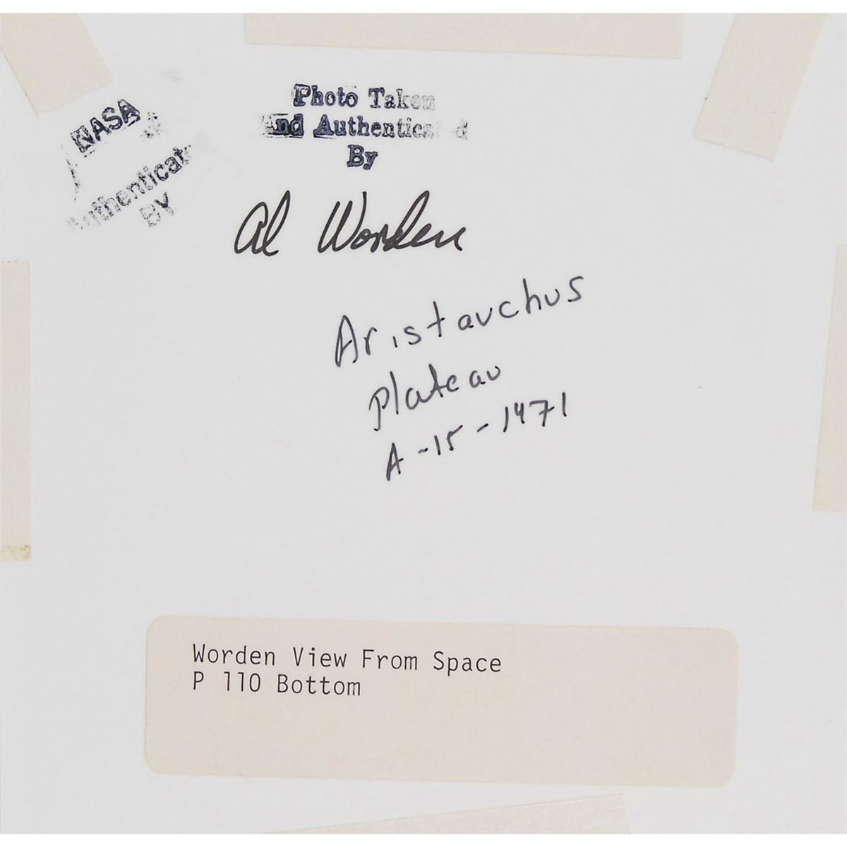 Two color satin-finish 4 x 4 photos of the lunar surface, matted together to an overall size of 16 x 20, signed on the mat in black felt tip. Reverse of photos bear stamps that read, “NASA authenticated by,” and are signed in black felt tip, “Al Worden,” with one signed twice. In fine condition. Provenance: Superior Auction, Fall 1998.