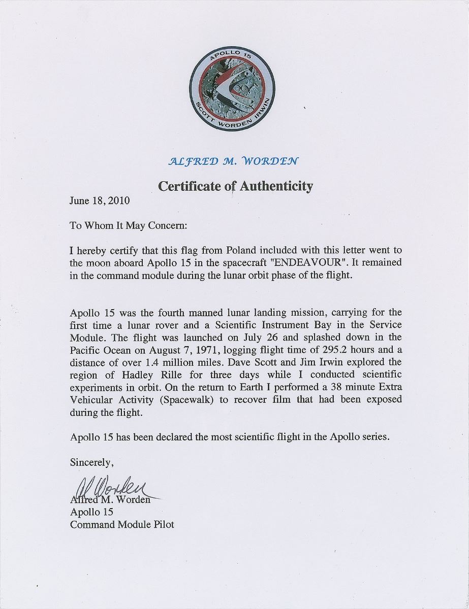 Flown fabric flag of Poland carried on board Apollo 15, 6 x 4, signed and flight-certified in black ink by Command Module Pilot Al Worden, “Flown to the Moon on Apollo 15, Al Worden CMP.” In fine condition. Accompanied by a letter of authenticity signed by Worden, in part: “I hereby certify that this flag from Poland included with this letter went to the moon aboard Apollo 15 in the spacecraft ‘Endeavour.’ It remained in the command module during the lunar orbit phase of the flight.”