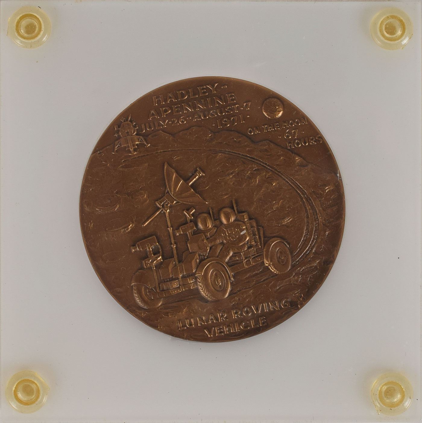 Uncommon Apollo 15 commemorative bronze medal, 2.5? in diameter, designed by Ralph J. Menconi and struck by the Medallic Art Co. of New York. The front shows the crew in relief with raised names and the mission lunar emblem; the reverse depicts the lunar rover driving on the Hadley-Apennine region, with raised text and the lunar module and Earth in the distance. Housed in a plastic 4 x 4 display case, signed on the front in black felt tip, “Al Worden, Apollo 15.” In fine condition.