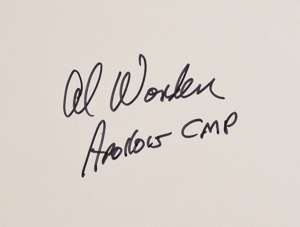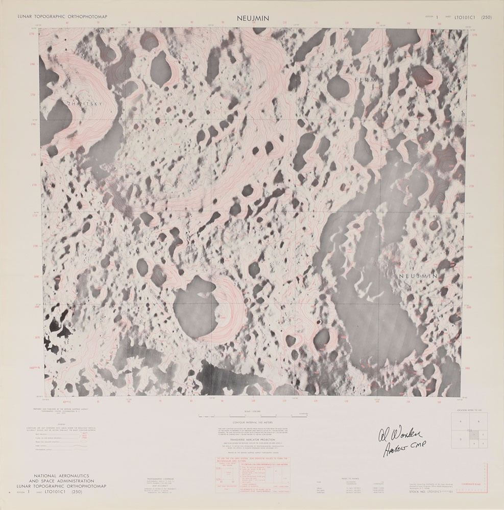 Color first edition of the Apollo 15 Lunar Topographic Orthophotomap, 25.5 x 26.5, sheet LTO101C1 (250), dated July 1973, showing a contoured transverse Mercator projection of the Neujmin crater on the Moon's far side, also identifying the Fermi and Zhiritskiy craters. Signed in the lower right in black felt tip, "Al Worden, Apollo 15 CMP." Prepared and published by the Defense Mapping Agency, Topographic Center, Washington, D.C. In fine condition.