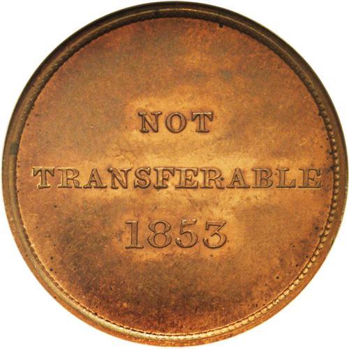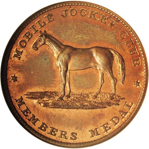 <B>Alabama 1853 ALA-3 Mobile Jockey Club, MS63 Red and Brown NGC.</B></I> Mislabeled by NGC as an ALA-2, but struck in copper. The obverse presents a nicely reflective, almost prooflike finish. A pleasant mixture of red and blue-brown colors combine overall.<BR><I>From The Troy Wiseman Collection.</B></I>
