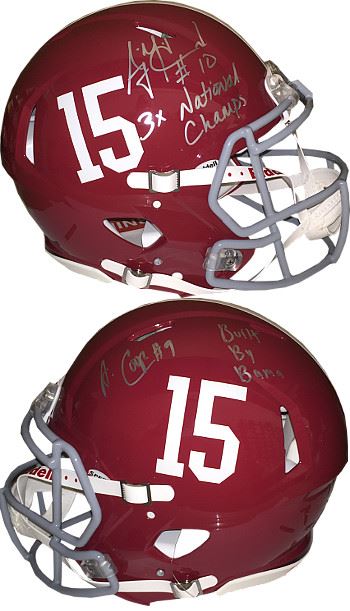 AJ McCarron played college football at Alabama. Following the 2013 BCS National Championship Game against Notre Dame, McCarron became the first quarterback to win back-to-back consensus national championships in the BCS era. In addition, since his freshman/redshirt year, McCarron has been associated with three national title teams under coach Nick Saban: 2009, 2011, and 2012. Amari Cooper played college football at Alabama. He was the Biletnikoff Award winner as the nation's top receiver and a unanimous All-American in 2014. Considered one of the top wide receiver prospects of the 2015 NFL Draft, he was selected 4th overall by the Raiders. AJ McCarron and Amari Cooper have hand signed this Alabama Crimson Tide #15 Full Size Speed Authentic Riddell Helmet with #10 3X National Champs and Built By Bama inscriptions. McCarron and Bama Authentics Hologram and Certificate of Authenticity from Athlon Sports Collectibles. Each signed 1 side of the Helmet