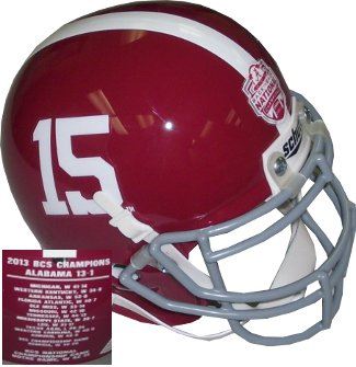 This is an Alabama Crimson Tide unsigned Schutt #15 Authentic Mini Helmet with Back to Back National Champs Logo. Special BCS Back to Back Champs Logo on Front and 2012 Schedule With Scores Logo on Back of Helmet.