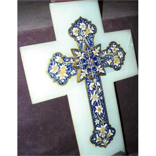 This beautiful antique European cross is made of alabaster and featured a cross and holy water font inlaid with champleve work in fine blue and red tones with lilies in the design. Size is 15"x9"