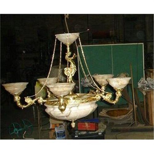 This relative small chandelier has five tulips of alabaster stone and a incredible beautiful casted bronze fittings.It will be shipped in two crates, one with the alabaster component the other one with the bronze component. Some assembly will be required. The shipping cost within USA is $ 175.00. This item was rewired to USA standars.Due to the nature of alabaster stone the pictures may not accurately represented the color and pattern of the alabaster.It will take 4 to 5 weeks to deliver