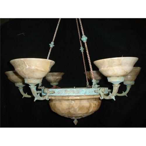 Six tulips alabaster stone and casted bronze chandelier. This chandelier is in very good condition. This item was rewired to USA standards and some of the rust removed.It will be shipped in two crates, one with the alabaster component the other one with the bronze component. Some assembly will be required. The shipping cost within USA is $ 175.00. Due to the nature of alabaster stone the pictures may not accurately represented the color and pattern of the alabaster.