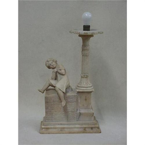 Italian alabaster lamp 11" x 5 3/4" base, figure of a child sitting atop a stone wall with carved, fluted lamp post. Condition is good, there are a few tiny dings on the lamp. Original shade missing.