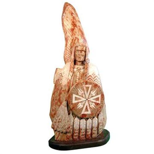 An exceptional carved alabaster sculpture of a Native American Indian. Standing 38" tall, 14" wide and 6" deep. Mounted on a wood base, 16" x 9.5". Signed by artist Mike Taleda, 1998. Excellent condition.