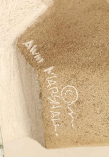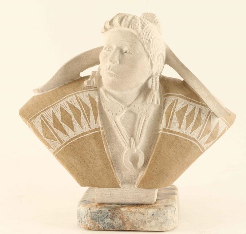 Bust of a Navajo woman by Alvin Marshall on marble base. Measures 9"l x 4"w x 8 1/2"h. Signed lower left side on back of sculpture. As a young boy Alvin Marshall was taken from his home on a Navajo reservation and placed in boarding schools where he was not permitted to speak the Navajo language or practice its traditions. By the age of ten he had lost both of his parents and it was his grandparents that taught him his Navajo culture which he hopes to pass on in his figurative sculpture. Marshall served in the US Army where he did some work in illustration. After his service he moved to the Shiprock Reservation where he worked first as a diesel mechanic and later as an illustrator. At that time he began sculpting and would go on searches for stone with his friend, Oreland Joe. For a short time he owned a gallery in Scottsdale, Arizona but not finding success it closed. He continued sculpting small pieces for a while but later dropped out of the art scene. Marshall eventually began carving again and has found success in galleries and at the Heard Museum in Phoenix, Arizona.