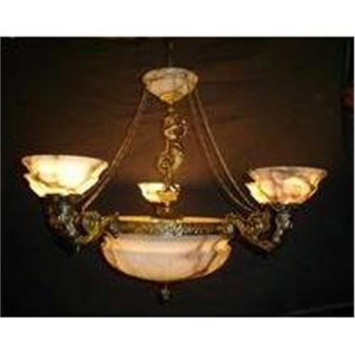 Five tulips, seven ligths, alabaster stone and casted bronze grand chandelier.It will be shipped in two crates, one with the alabaster component the other one with the bronze component. Some assembly will be required. The shipping cost within USA is $ 175.00. This iten is in working condition and was rewired to USA standards.