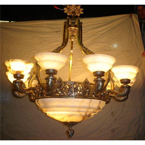 Ten tulips, twelve lights, casted bronze and alabaster stone chandelier. It will be shipped in two crates, one with the alabaster component the other one with the bronze component. Some assembly will be required. The shipping cost within USA is $ 175.00. This item was rewired to USA standards. It will take 4 to 5 weeks to deliver