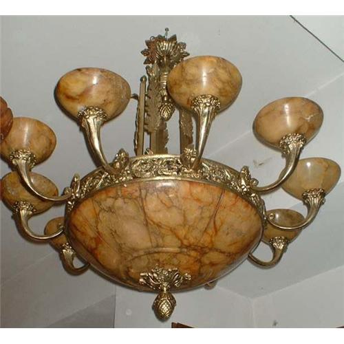 <tr><td>Title:Alabaster stone and casted bronze chandelier. </td></tr>