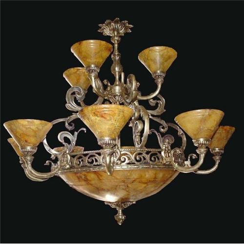 Twelve tulips, fourteen ligths, two tier alabaster stone and casted bronze grand chandelier. When lit this chandelier glow in a unique manner due to its particular shape.It will be shipped in two crates, one with the alabaster component the other one with the bronze component. Some assembly will be required. The shipping cost within USA is $ 175.00. This item was rewired to USA standards.