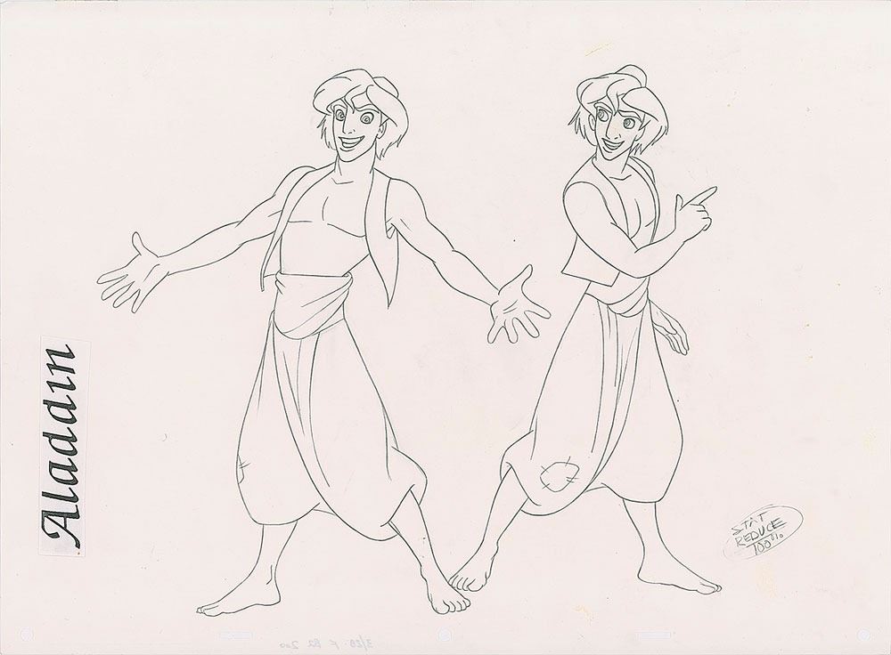 (Walt Disney Studios, 1992) Original character model drawing of Aladdin in two different poses, accomplished in graphite on untrimmed 17 x 12.5 animation paper. An "Aladdin" label is affixed to the left side. In fine condition.