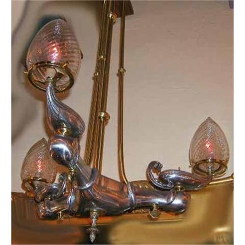 Aladdin Lamp Chandelier. Three Aladdin Lamps built into a handsome chandelier. Originally gas, now electrified. Swirl cone blown shades sit on three inch brass rings. A rare one. Visually exciting.