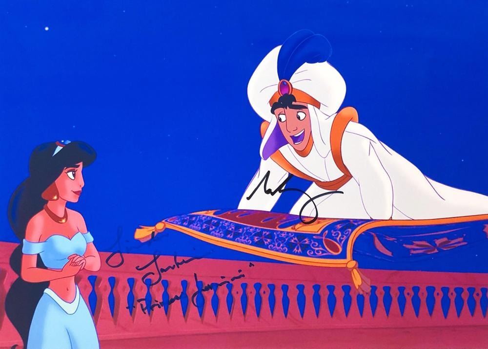 Aladdin Linda Larkin and Scott Weinger facsimile signed movie photo. 8x10 inches. This item is a reprint of an original autograph