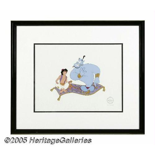 <B>Aladdin and Genie Limited Edition Sericel (The Walt Disney Company, 1992).</B></I> This limited edition sericel depicts Aladdin, Abu, and the Genie from Walt Disney's animated feature ""Aladdin"". Walt Disney artists created this character image using the fine art screen-printing process of color reproduction known as serigraphy. Limited to an edition of 2,500, this sericel has an image area measuring 13"" x 10"", and the condition is Excellent. This lot also includes a certificate of authenticity. <BR><BR><B>Important notice:</B> Heritage usually auctions material at the rate of 200-250 lots per hour. On some occasions eBay Live bid software or the Internet may not be able to keep up with the pace of the auction. We recommend placing a realistic absentee bid now as insurance to avoid disappointment. Occasionally the auctioneer may eliminate or reject an eBay Live bid, and the auctioneer may also reopen a lot after the close of the eBay live bidding (usually because we missed an audience bid), and may reject your bid even if it shows you as the winning bidder. By bidding via eBay Live, you agree that Heritage may award the lot to another bidder at its sole discretion under the circumstances described above or any other reasonable circumstances. Since eBay bids are not shown to us until we open the lot on the floor, we treat those bids just like floor bids. In most cases the floor responds before the eBay bid is presented to us, due to Internet lag time, so for consistency we have made it a policy that floor bids are always considered first over tie eBay live bids. Also please note that all Heritage lots purchased through eBay Live carry a 20% Buyer's Premium. Please make sure you read the Terms and Conditions before you bid. This lot is being auctioned in conjunction with a live floor auction by Heritage Galleries & Auctioneers. All final auction and invoice information will be supplied by Heritage Galleries & Auctioneers, and all other information should be cons