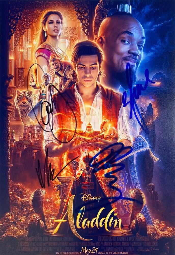 Aladdin cast facsimile signed movie photo autographed by Mena Massoud, Will Smith, Naomi Scott and Marwan Kenzari . 8x10 inches. This item is a reprint of an original autograph