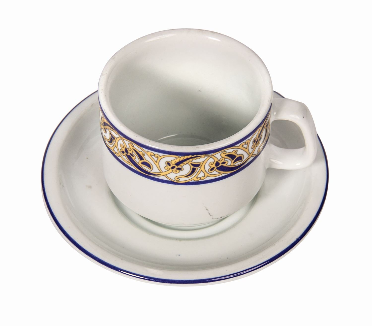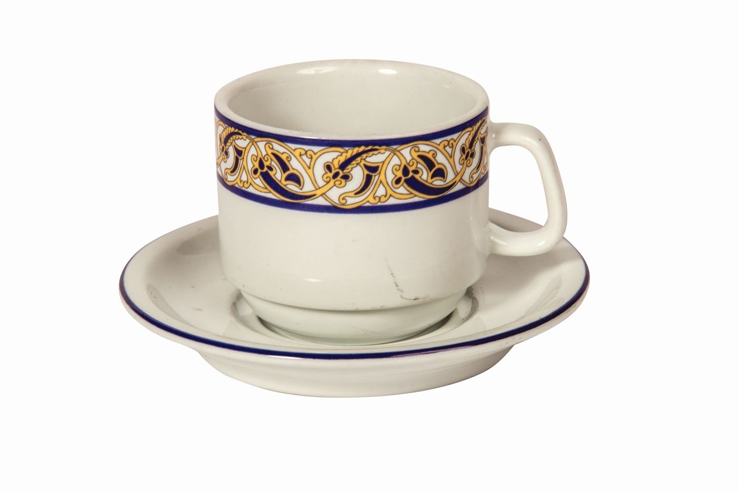 (Disneyland, c.1990s) A coffee cup and saucer from Aladdin's Oasis in Disneyland. The short-lived restaurant operated for only a couple of seasons before the area was eliminated as a dining location. Both the cup and saucer are marked as being made exclusively for Aladdin's Oasis on the bottom. The cup measures 2.75" and the saucer is 5.5" in diameter, and both are in good condition with some wear from use. The cup has a few spots of scuffing to the surface.