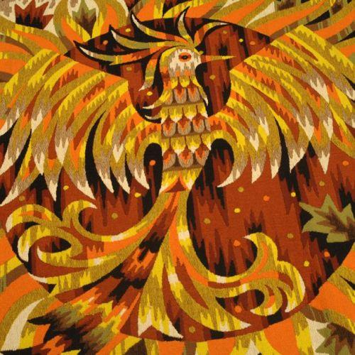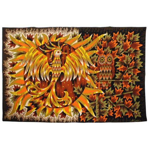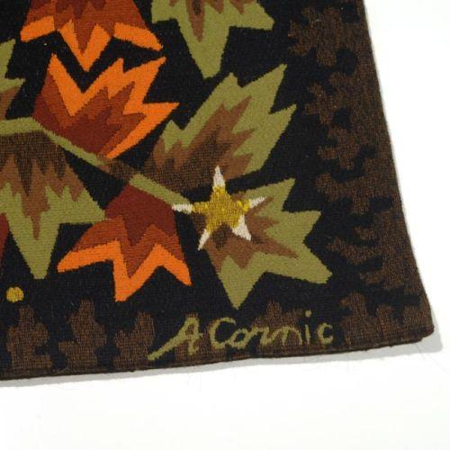 46h x 50w inches, wall carpet, decorated with a thunderbird and an owl, signed by A. Cornic lower right, in excellent condition