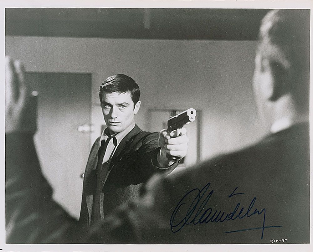 Glossy 10 x 8 photo of Delon wielding a pistol in the 1965 film L’Insoumis, signed in black felt tip. In fine condition, with some scattered light surface marks and impressions. Consignor notes signature was obtained at the Everyman Theatre in London in the late 1980s.