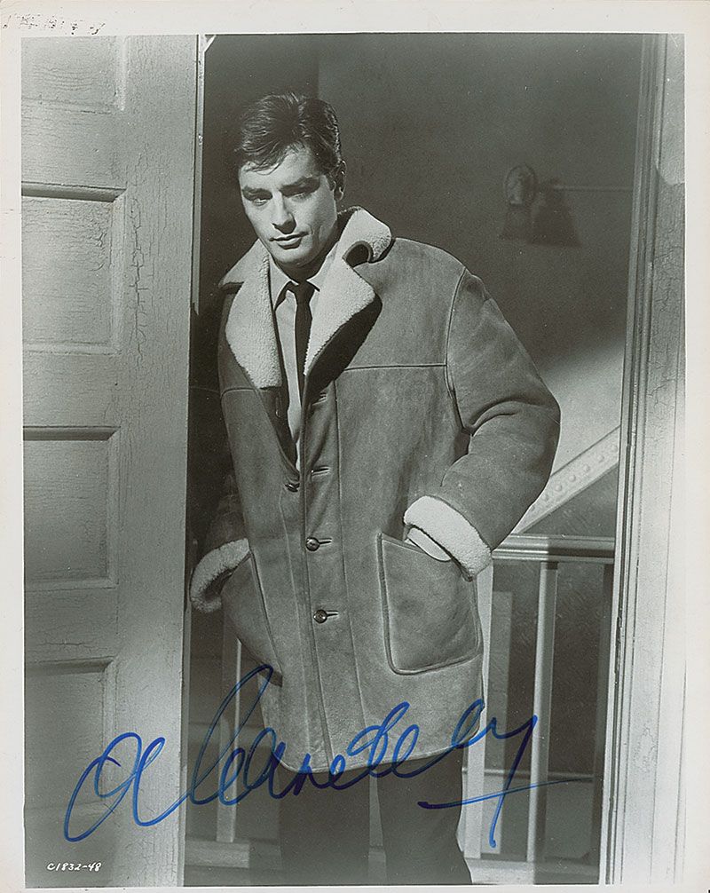 Glossy 8 x 10 photo of Delon standing in a doorway in one of his films, signed in blue felt tip. In fine condition.