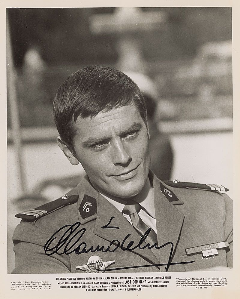 Glossy 8 x 10 Columbia Pictures promotional photo of Delon as he appeared in Lost Command, boldly signed in black felt tip. In fine condition.