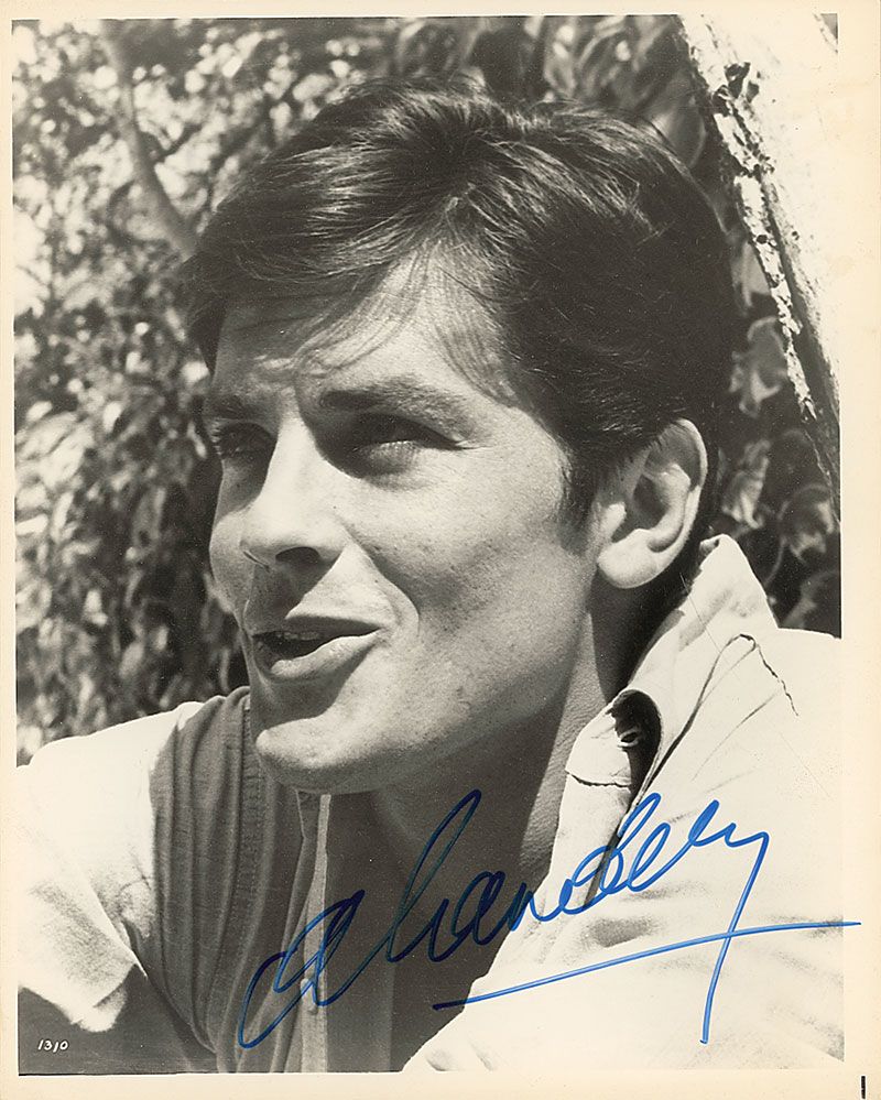 Glossy 8 x 10 head-and-shoulders photo of Delon posing outdoors, signed in blue felt tip. In fine condition, with some light surface impressions from notations on reverse.