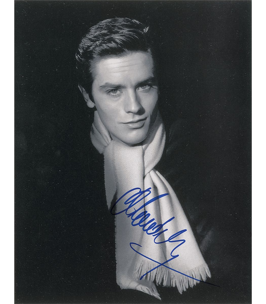 Satin-finish 8 x 10 photo of Delon in dim light, signed in blue felt tip. In very fine condition.