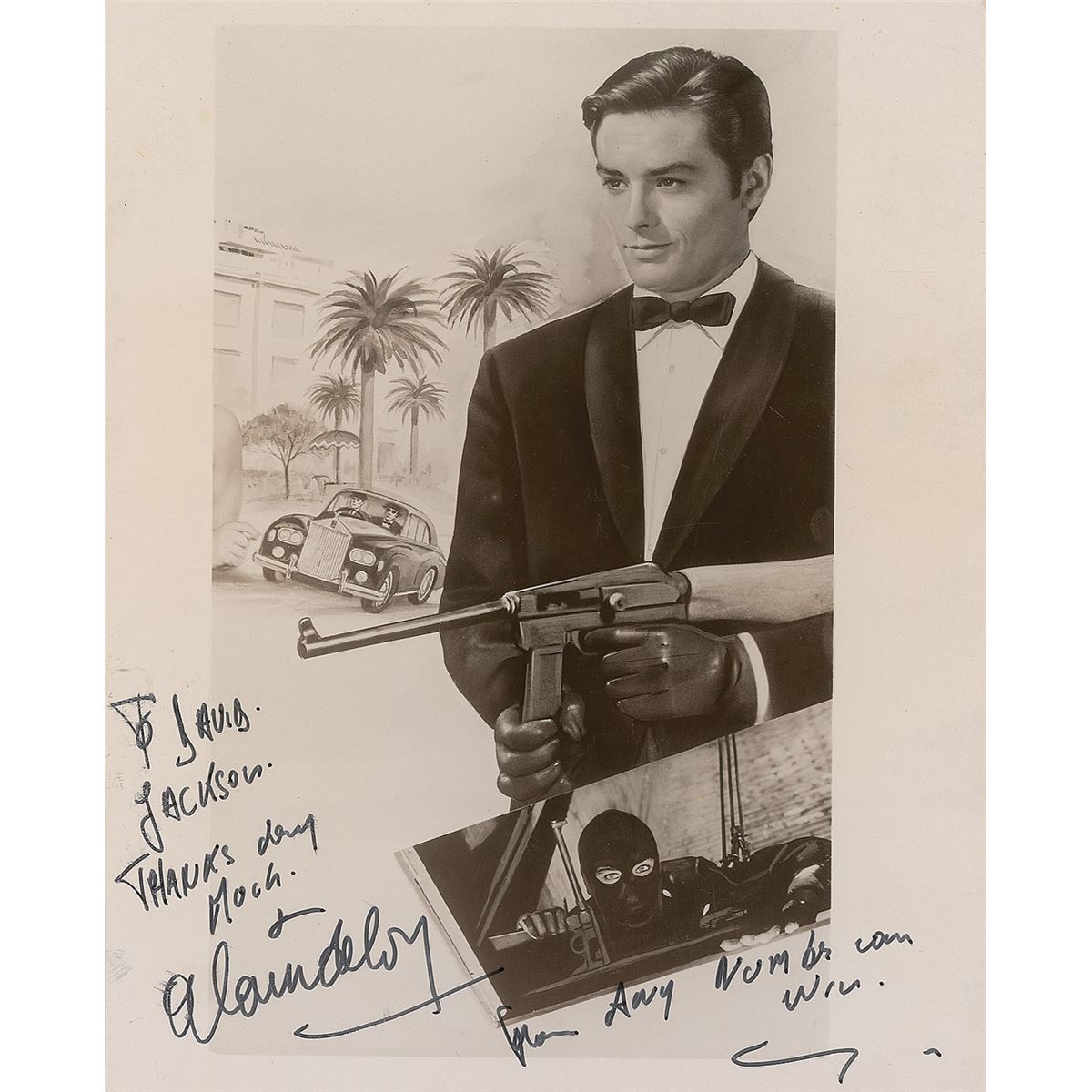 Glossy 8 x 10 photo depicting Delon in the 1963 film Any Number Can Win, signed and inscribed in black felt tip, “To David Jackson, thanks very much, Alain Delon,” who adds the name of the movie. Some brushing to the inscription and signature, and light scattered creasing, otherwise fine condition.
