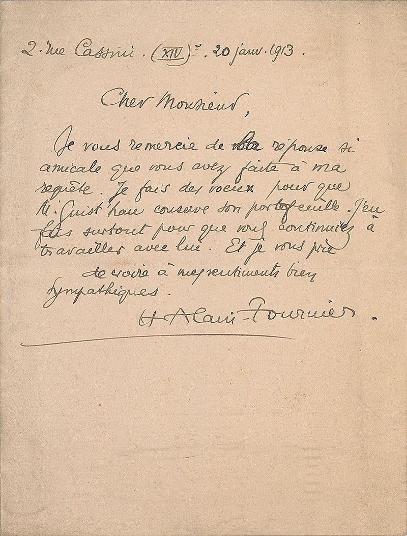 French author and soldier (1886–1914) whose novel Le Grand Meaulnes is considered a classic of French literature. ALS in French, signed “H. Alain-Fournier,” one page, 5.25 x 7, January 20, 1913. Letter to a gentleman, regarding a French Minister being able to retain his post. Uniform toning and scattered soiling, otherwise fine condition.