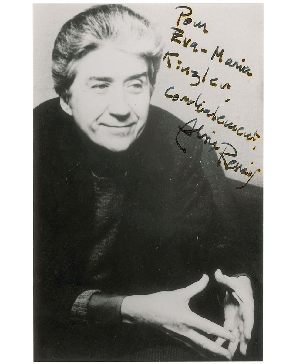 Prolific French film director (born 1922) whose career has extended over more than six decades. Glossy 3.25 x 5 photo of Resnais in a tranquil state, signed and inscribed in black ink, “Pour Eva-Maria Kinzler, Cordialement, Alain Resnais.” In fine condition, with slight haloing to signature and inscription.