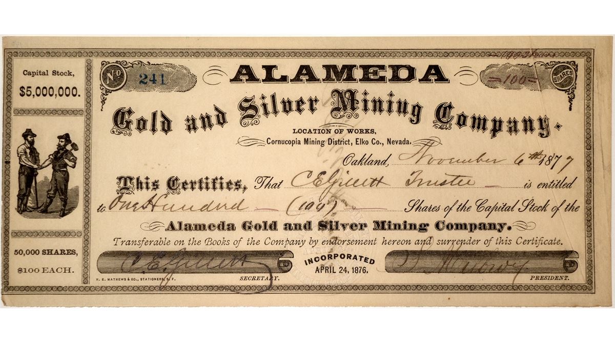 Uncancelled stock, no. 241 issued to C. E. Gillett, Trustee, 100 shares signed by S. Millroy, President and C. E. Gillett, Secretary, 1877. Cornucopia mining district, Elko county.