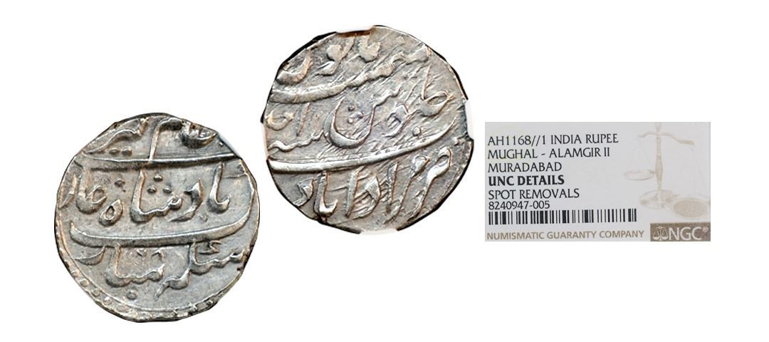 Alamgir II, Muradabad Mint, Silver Rupee, 1068 AH, Ahad RY, Obv: sikka mubarak badshah ghazi, Rev: sana julus zarb, graded by NGC UNC Details, Rare