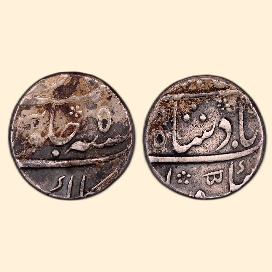 Bengal Presidency, Kalkatta Mint, Silver Rupee, 11.53g, in the name of Alamgir II, RY 5, star symbol on obv. as a mint mark. (P. Stevens # 1.10). Fine. Extremely Rare. Earlier Alamgir II rupees mint name was Alinagar Kalkatta, after the British recaptured the city from the Nawab in January 1757 the mint-name was changed to Kalkatta only.