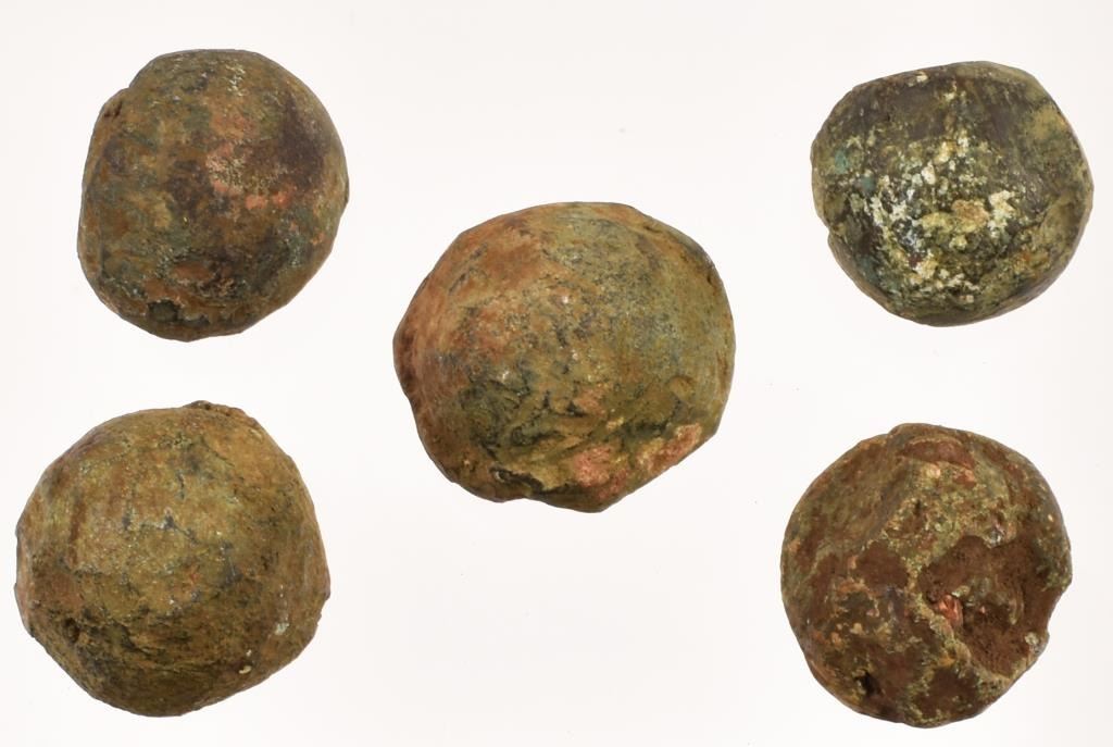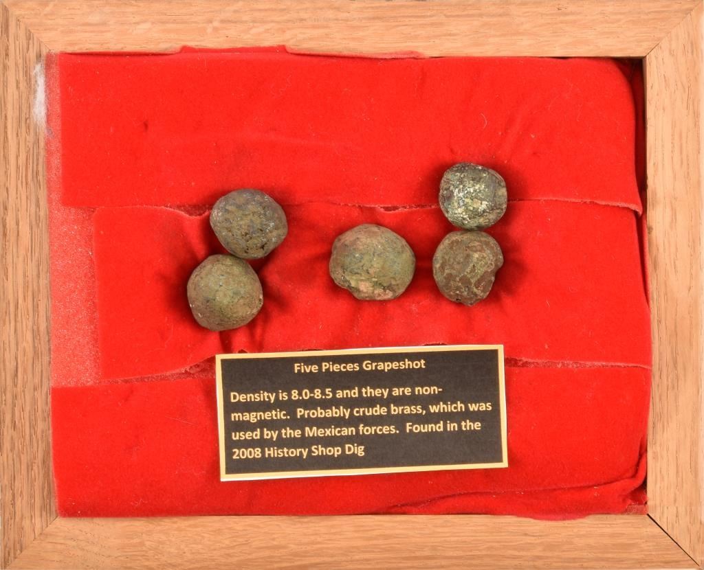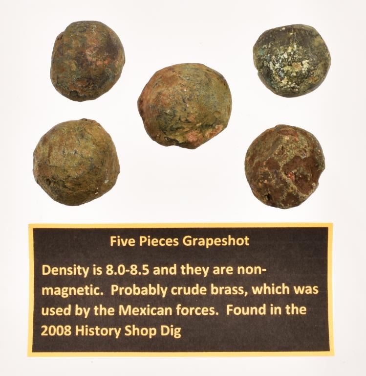 Density is 8.0 - 8.5 and they are non-magnetic. Probably crude brass, which was used by Mexican forces. Found during the 2008 History Shop excavation with paperwork