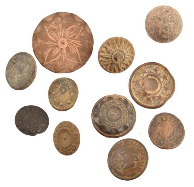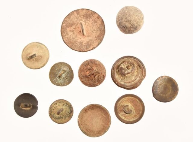 Rifle shot found in fire pit #2. Assorted buttons, some Spanish, found in fire pit #3. found during the 2008 excavation below the History Shop right across the street from the Alamo. Fully documented with photos Battle of the Alamo battlefield dug relics. With provenance paperwork & photo documentation of the dig.