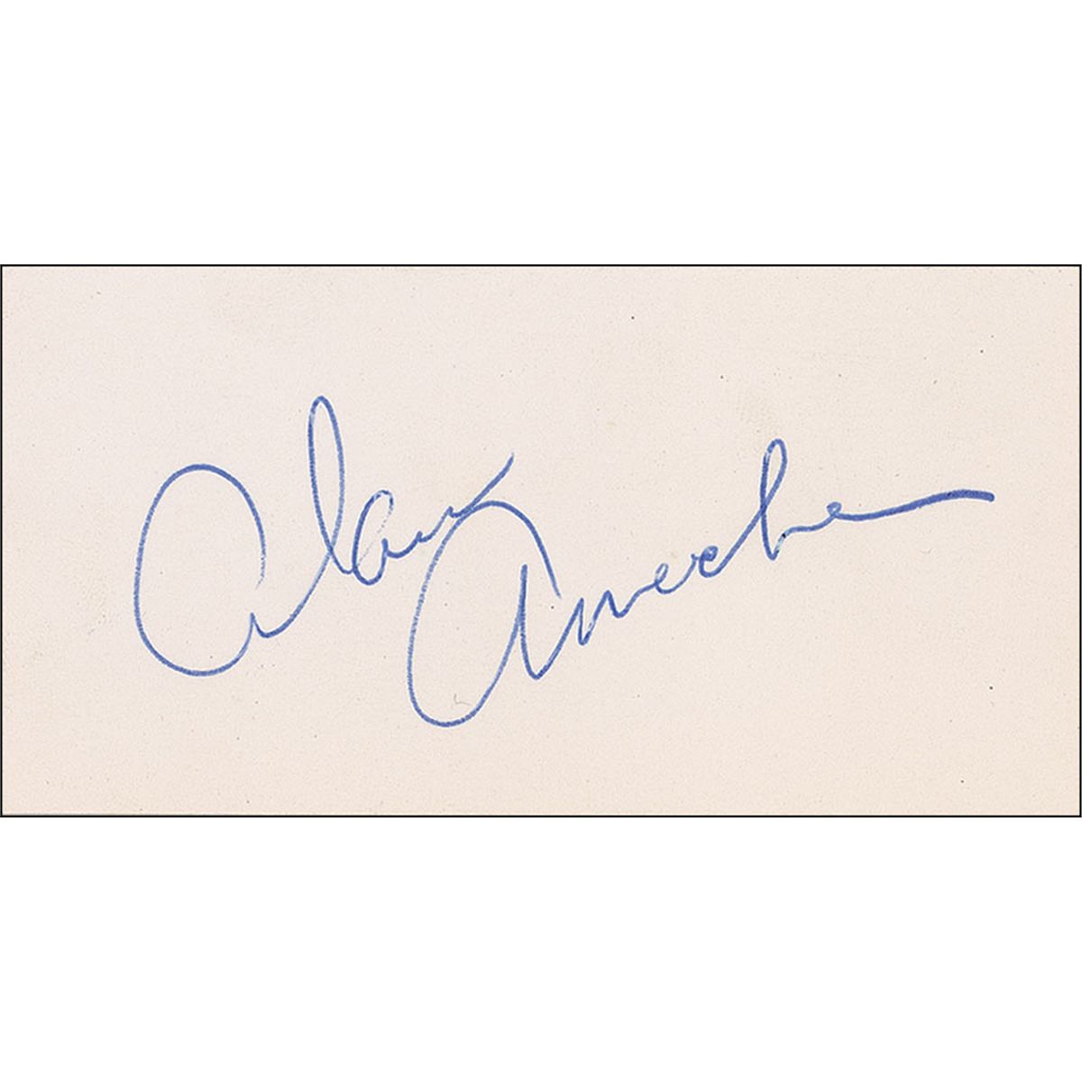 Pristine ballpoint signature, “Alan Ameche,” on an off-white 3.5 x 1.75 card. In fine condition.