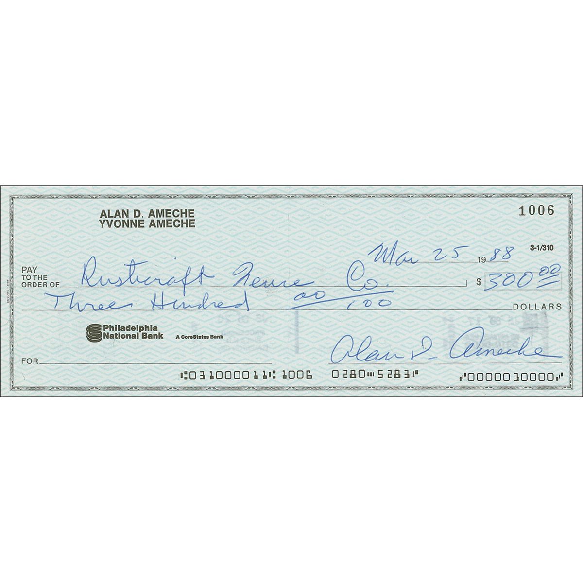 College Football Hall of Famer and Heisman trophy winner (1933–1988) best known for his role in the 1958 NFL championship game known as ‘The Greatest Game Ever Played.’ Ameche scored the winning touchdown for the Colts on a one-yard run in overtime as the Colts beat the Giants 23–17. Personal check, 8.25 x 3, filled out and signed by Ameche, “Alan D. Ameche,” payable to Rustcraft Fence Co. for $300.00, March 25, 1988. In fine condition, with a central vertical fold and light show-through from stamps under signature.